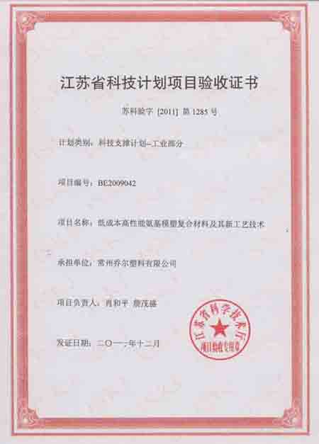 Jiangsu Province Science and Technology Project Acceptance Certificate