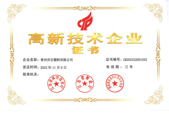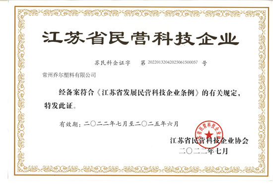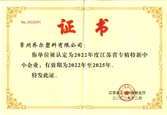 | 喬爾江蘇省專精特新中小企業(yè)證書 |