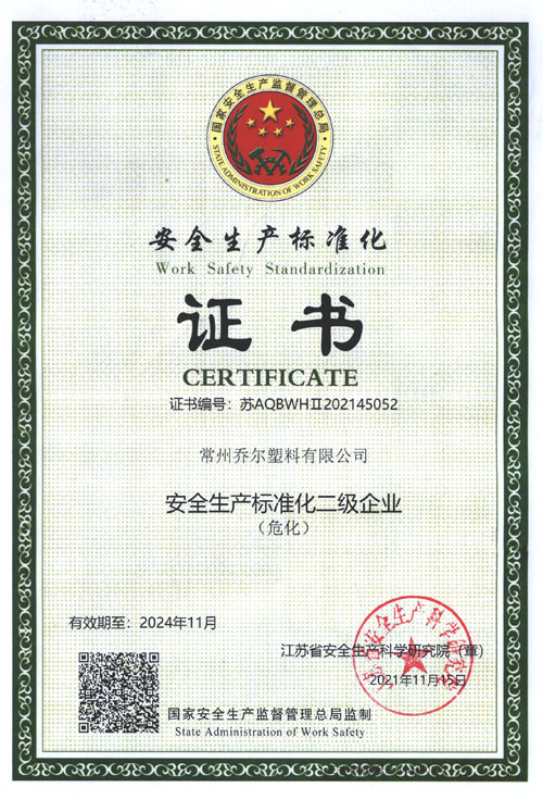 喬爾安全生產(chǎn)標(biāo)準(zhǔn)化證書 |